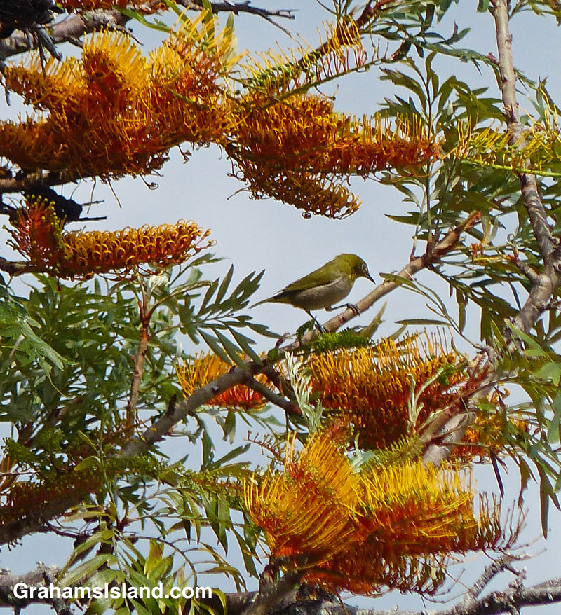 The brilliant orange flowers of silk oak trees not only catch the eye, but are rich with nectar, making them a favorite of birds such as Japanese white-eyes. There were several flitting through this particular tree.
