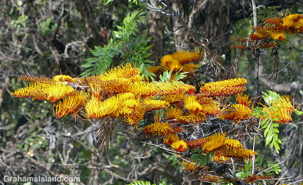 At this time of year, silk oaks are blooming and their orange flowers put on a brilliant display. They look like giant toothbrushes, or rather groups of flowers look like that, for the toothbrushes are made up of many individual flowers. The flowers themselves are popular with birds, bees and other insects, but both the flowers and wood can cause allergic reactions so have to be handled with caution.