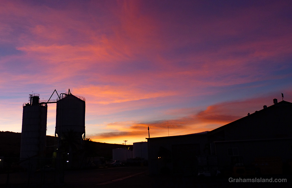 When people think about Hawaii, one of the things that comes to mind is wonderful sunsets and sunrises, such as this one, with the sun rising over the cement tanks. Well, maybe not that last bit, but that’s what’s happening here, the cement tanks in question being at the port in Kawaihae. And it was still a lovely sunrise.