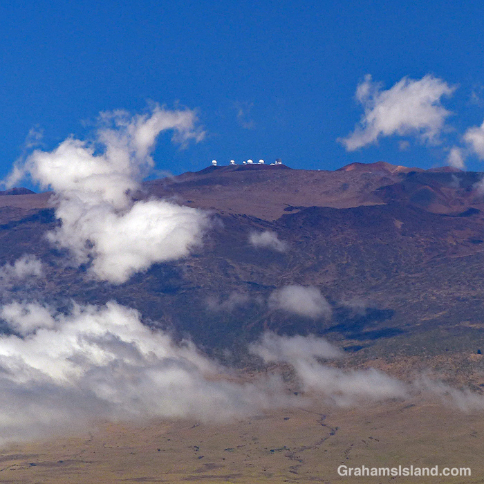 The top photo is a late afternoon view from near the summit of Mauna Kea, with the Subaru Telescope on the left and the two Keck Telescopes to the right. The top of the cloud layer lies a thousand or more feet below them, which is one of the reasons it’s such a prime site for astronomy.