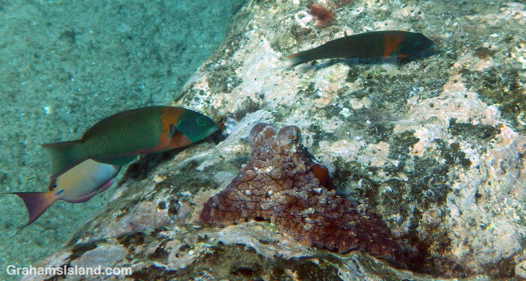 I’ve been lucky enough to see quite a few, once three in one swim. But sometimes there are weeks between sightings. As for photos, the good news is that when I spot an octopus it rarely moves, meaning I have time to get a photo. The bad news is that they blend in so well I invariably end up with offerings where I have to say something like, “It’s right there, near that coral. No, that’s not a rock.”